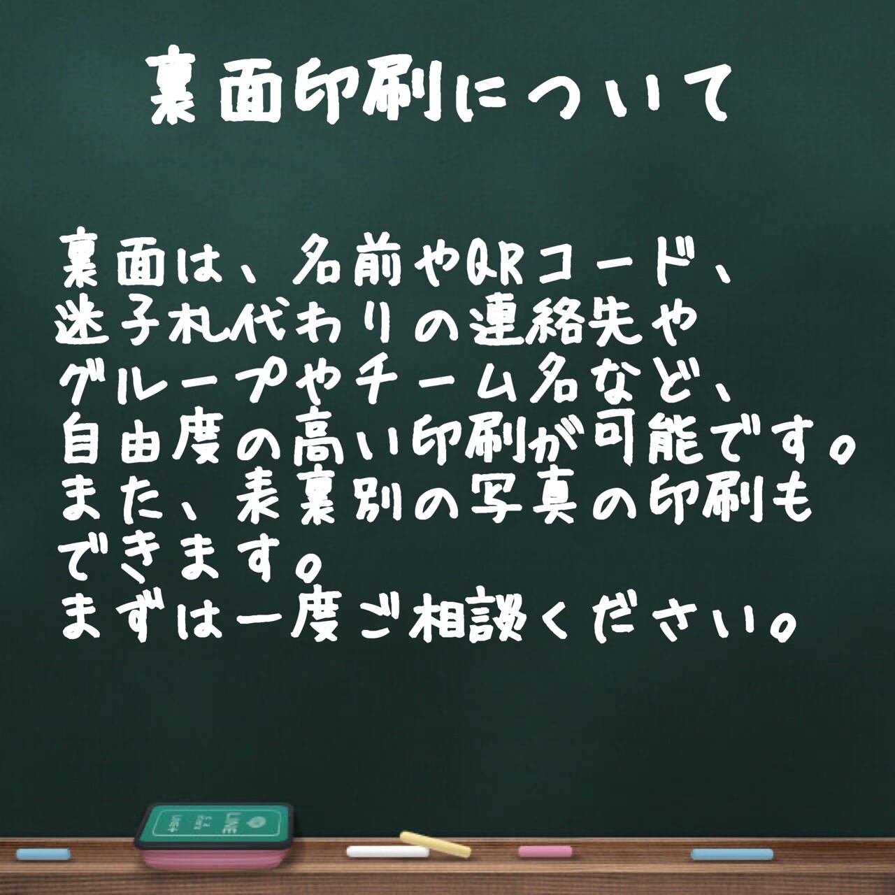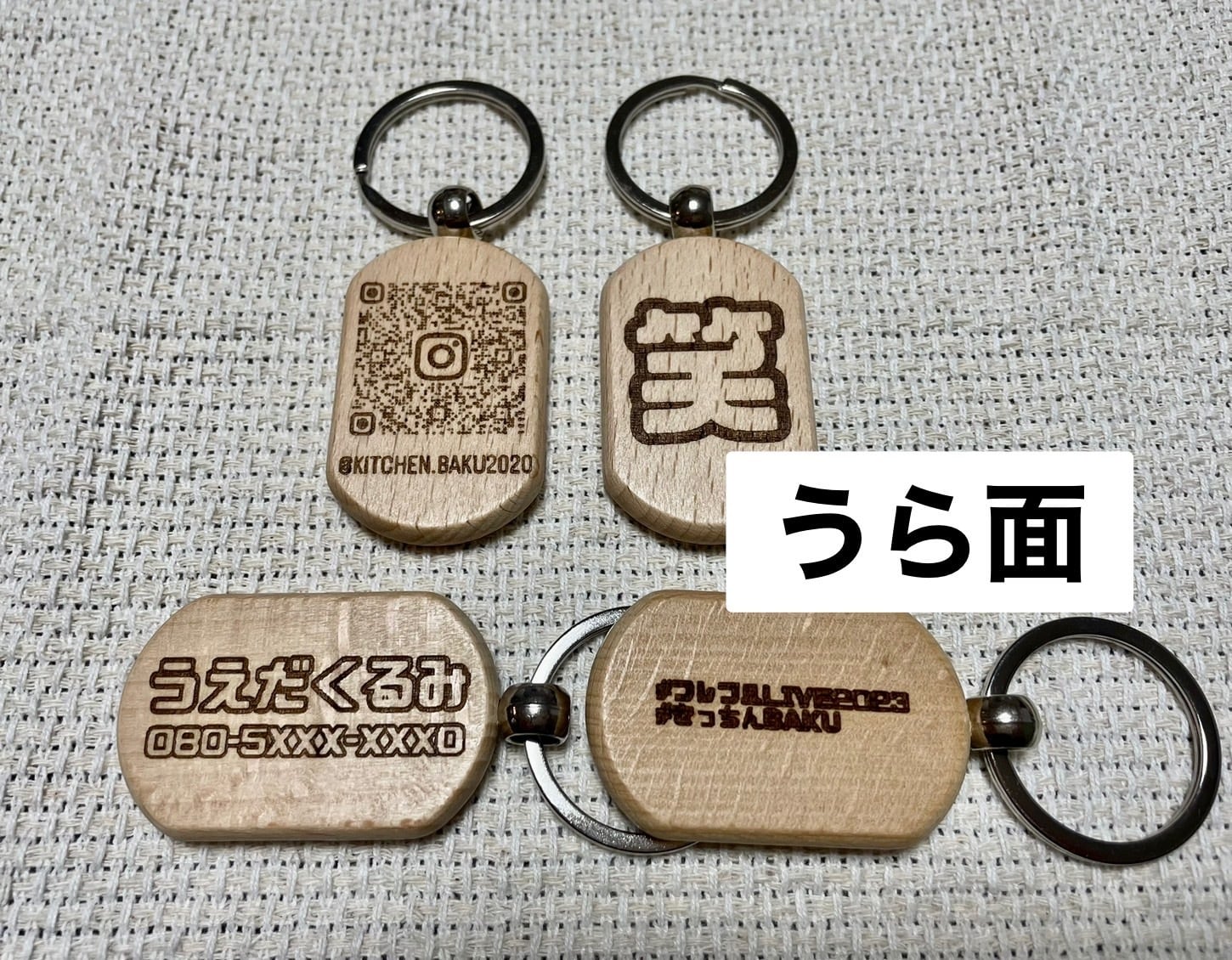 うら面には名前や電話番号の他、Instagram等のQRコードを刻印することもできます。